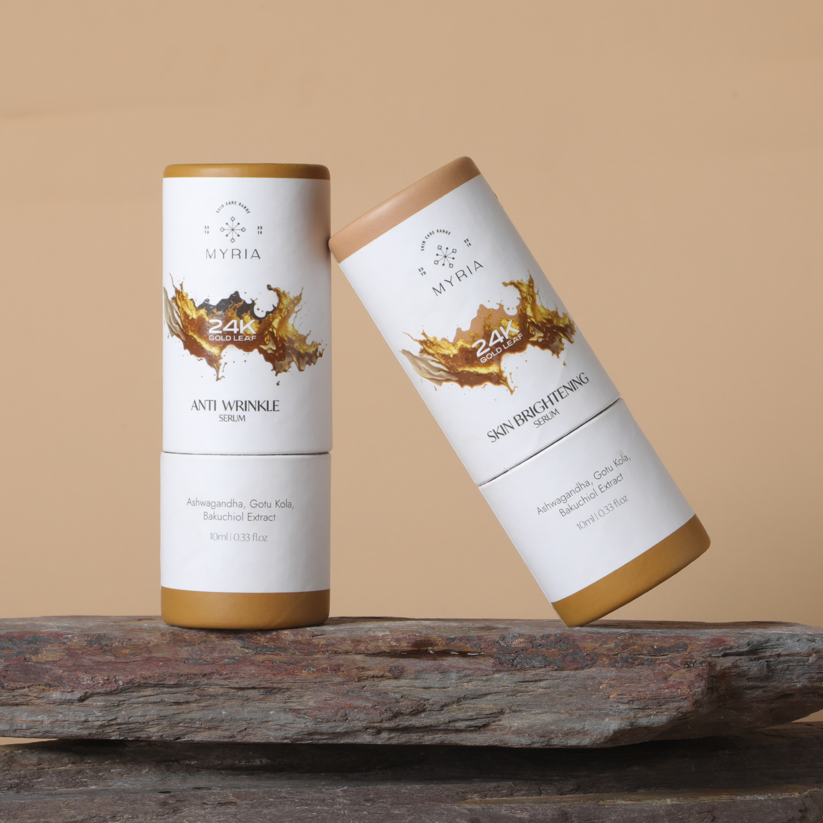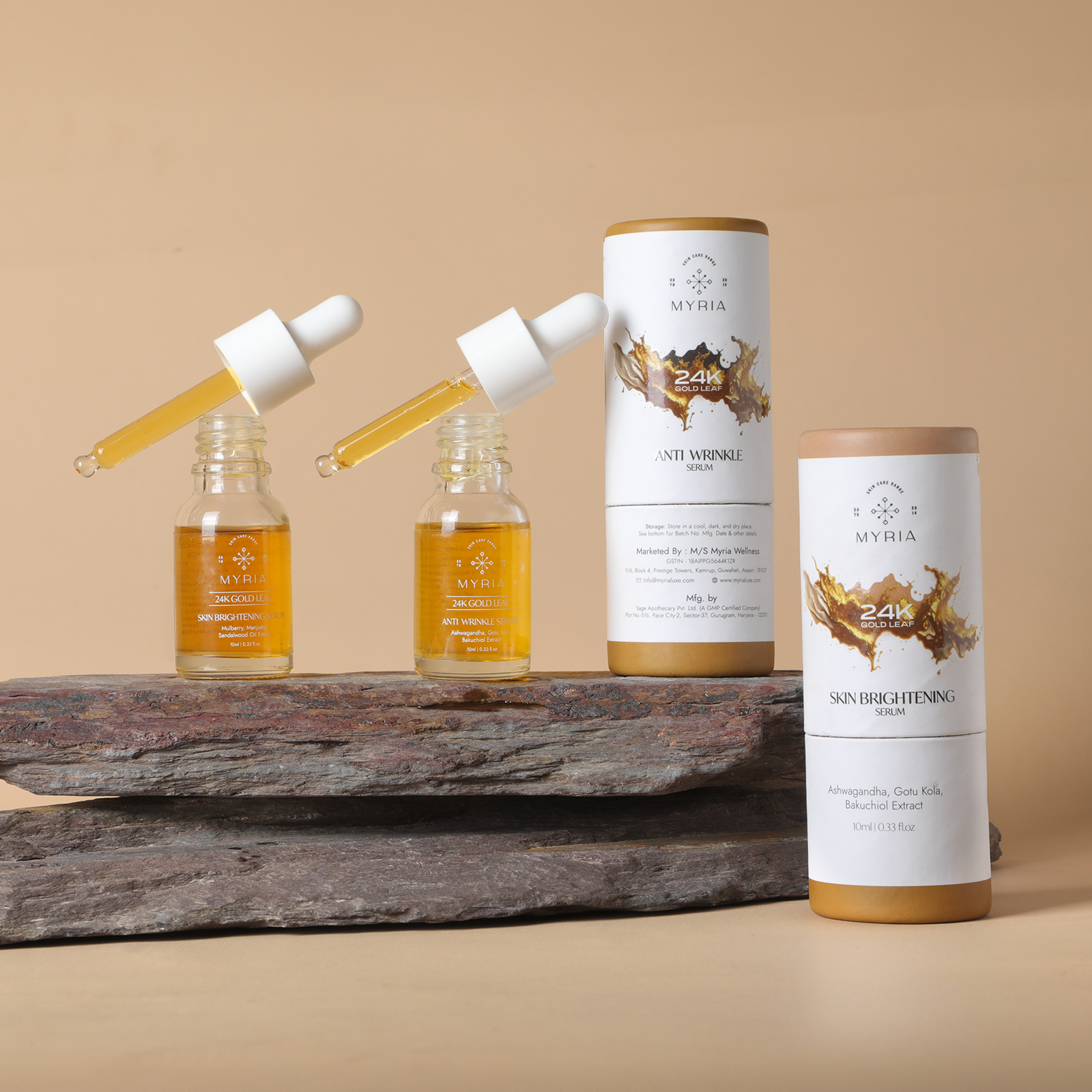 Experience a luxurious skincare ritual with Myria’s exclusive duo—Skin Brightening Serum and Anti-Wrinkle Serum—each infused with genuine 24K gold to uplift your skin’s radiance and vitality.